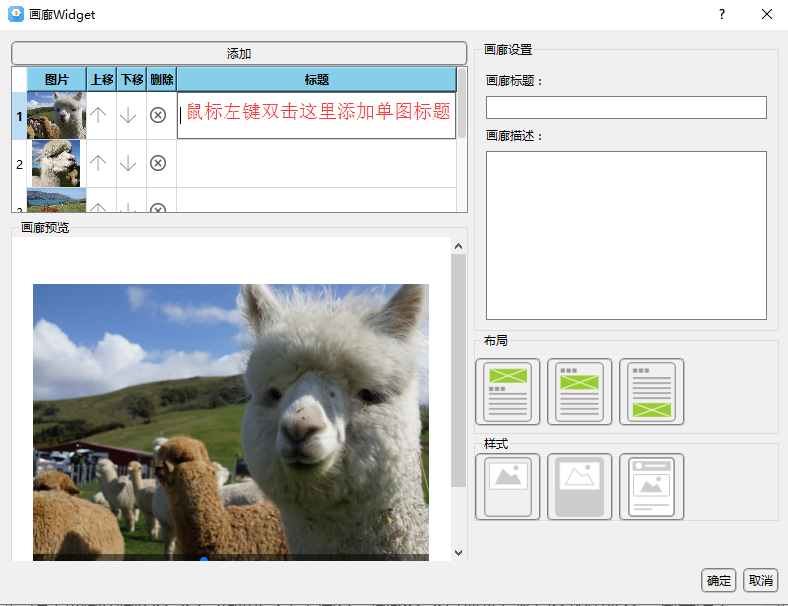答:如下圖是畫廊widget界面,鼠標(biāo)定位到畫廊單圖標(biāo)題處后左鍵雙擊標(biāo)題空白處添加單圖標(biāo)題,如下圖。
